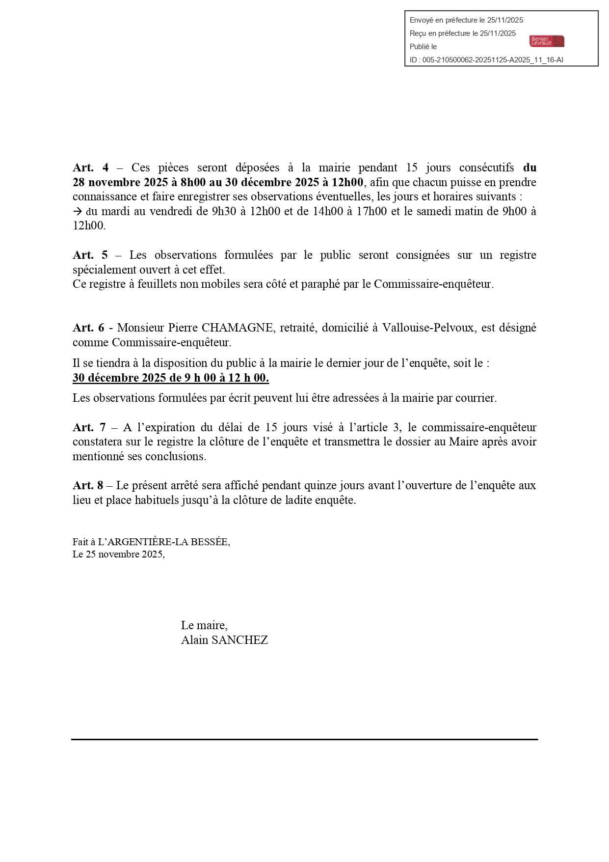 Un commissaire enquêteur tiendra une permanence le mardi 30 décembre de 9h à 12h. Observation écrite à lui adresser en mairie avant le 30 décembre 2025.