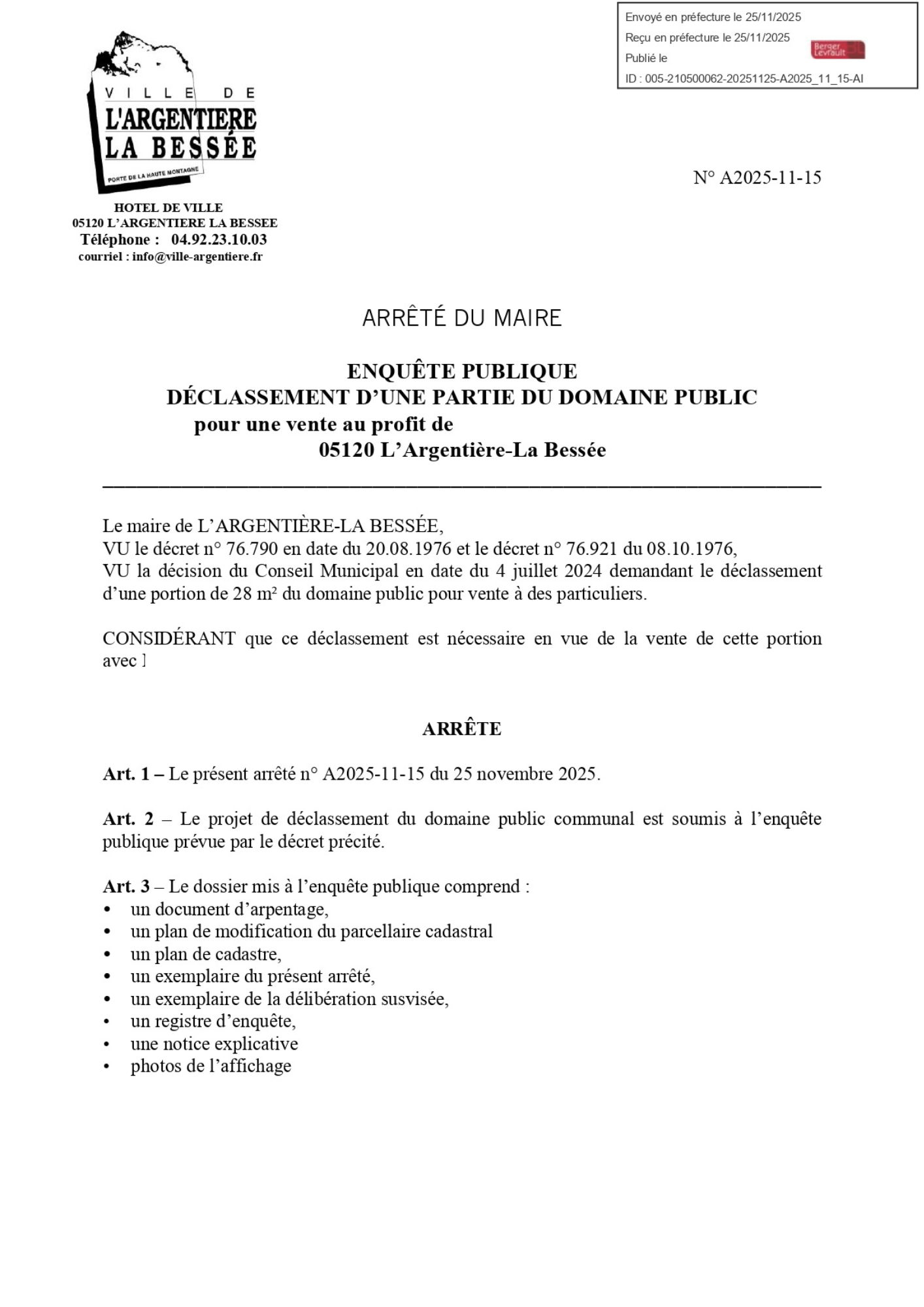 INFORMATIONS ENQUETES PUBLIQUES POUR DECLASSEMENT SUR LE DOMAINE PUBLIC